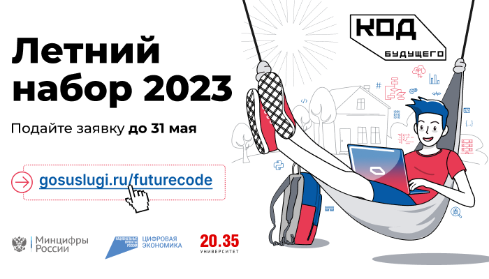 27.04.2023Объявлен набор учащихся 8-11 классов на летние образовательные программы проекта«Код будущего». Благодаря национальному проекту «Цифровая экономика» на летних каникулах школьники смогут бесплатно изучить разработку приложений, сайтов и игр на Python, а также новые языки программирования — PHP, Javascript и другие. Для записи на портале Госуслуг доступны 19 курсов от 12 образовательных организаций, среди которых крупнейшие ИТ-платформы и ведущие ИТ-университеты. Каждый курс состоит из 4 модулей по 36 академических часов. Летом в ускоренном формате можно освоить первые 2-3 модуля, остальные — осенью 2023 года. Успешно сдав экзамены, ребята получат сертификат об окончании курса. Школьники со всей страны могут обучаться онлайн. Очное обучение открыто в следующих регионах: Алтайский, Краснодарский и Красноярский край, Москва, Санкт-Петербург, Московская, Тульская и Челябинская область, ЯНАО. Как записаться на курсы: 1. Выберите курс иподайте заявление на Госуслугах 2. Пройдите вступительное испытание 3. Приступайте к обучению в группе Обучение бесплатное. Программу реализует Минцифры России в рамках проекта «Развитие кадрового потенциала ИТ-отрасли»национального проекта «Цифровая экономика». Оператор проекта — Университет 2035. Прием заявок продлится до 31 мая 2023 года. Успейте записаться: количество мест ограничено! Записаться на курс Справочно: «Код будущего» — уникальный образовательный проект для учеников 8-11 классов: они могут бесплатно изучить современные языки программирования на двухлетних курсах в онлайн и офлайн-формате. Осенью 2022 года на курсы записались и начали учиться более 130 тысяч школьников