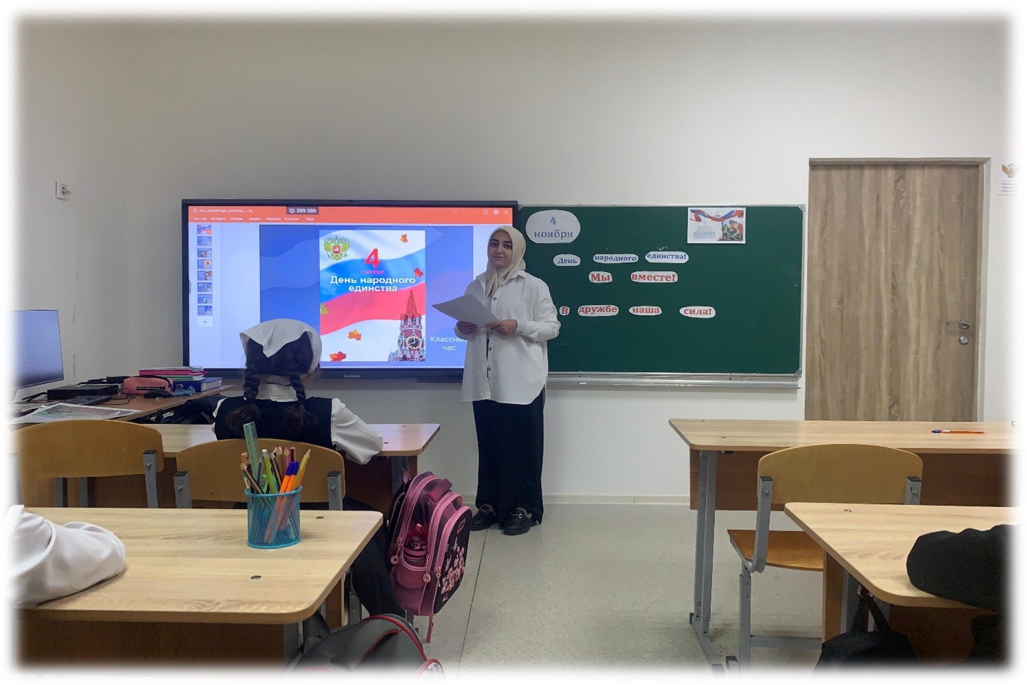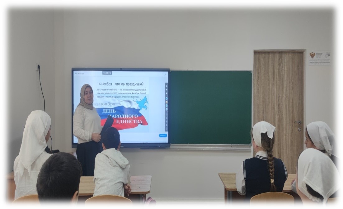 С обучающимися 5-9 классах зам. директора по ВР Насухановой А.В. прошла беседа на тему «Из истории праздника -День народного единства». Ребятам рассказала об истории возникновения праздника День народного единства, о подвигах народа, провела беседу на тему мужества и чести.