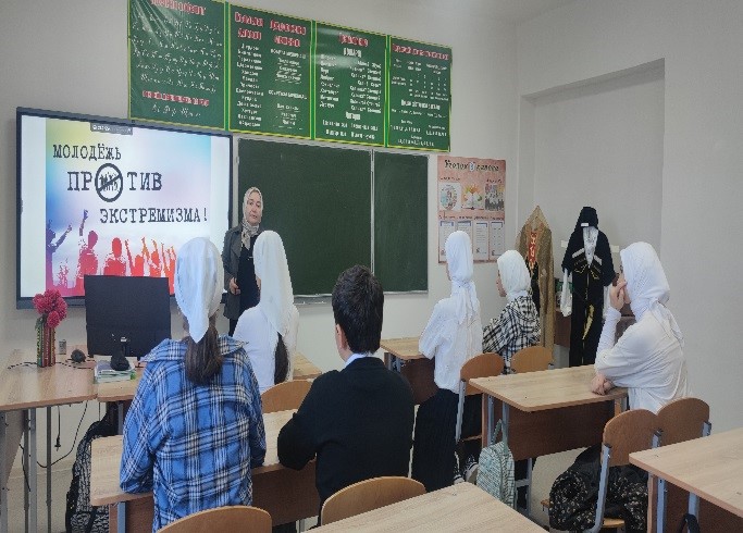 10.10.2024г. зам. дир. по ВР Насуханова А.В. провела для учащихся 9 класса беседу на тему: «Терроризм – угроза обществу», охват-12 чел.