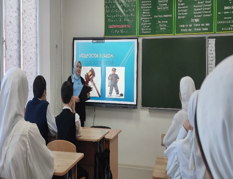 13.01.2025г. зам. дир. по ВР Насуханова А.В. провела для учащихся 8 класса беседу на тему: Беседа на тему: «Подросток и закон», охват-12 чел.
