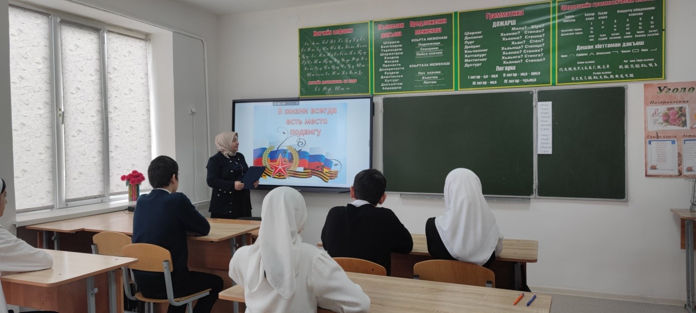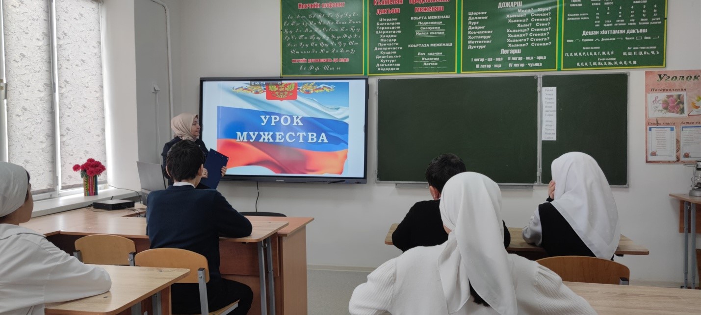 19.02.2025г. за.дир по ВР Насуханова А.В. провела для учащихся 8 класса урок мужества на тему:, «Герои нашего времени», охват- 12 чел.