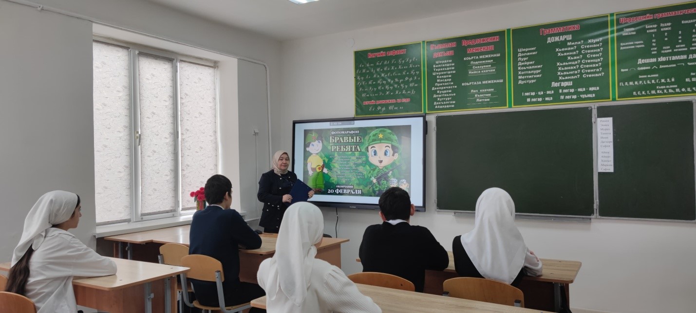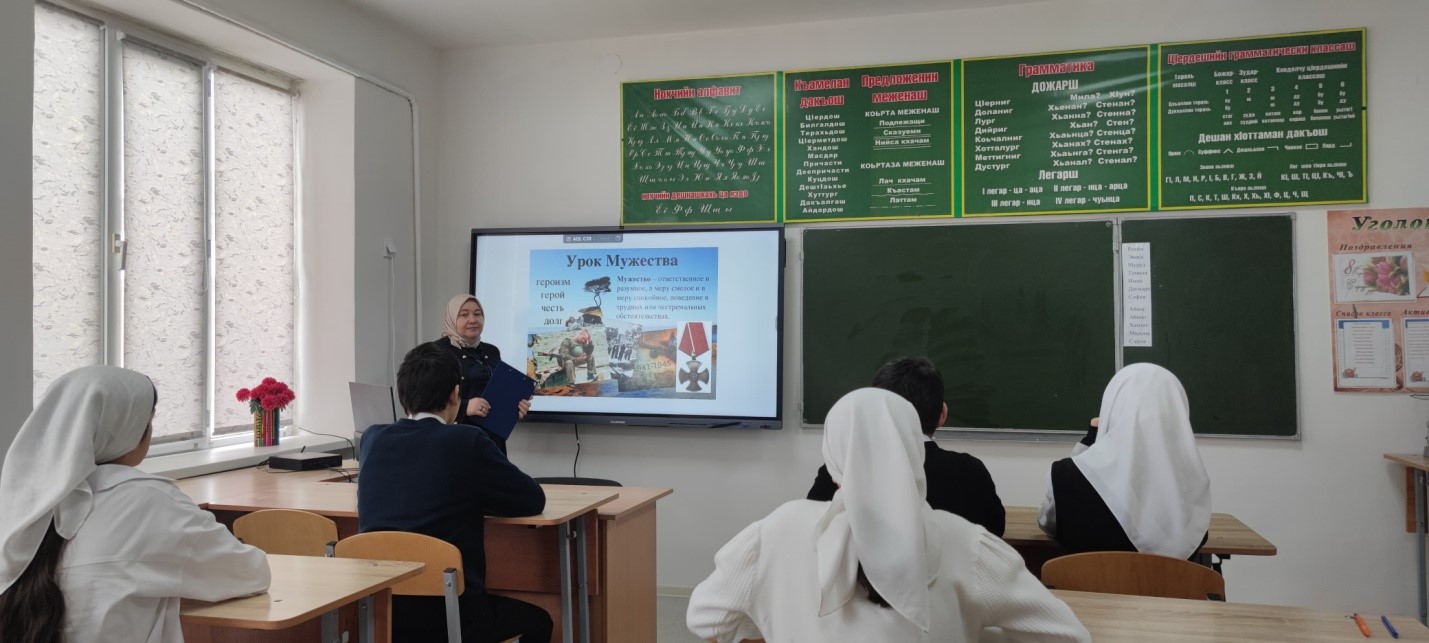 10.02.2025г. зам.дир. по ВР Насуханова А.В. провела для учащихся 8 класса урок мужества, посвященный участникам СВО на тему: «Бравые ребята»охват- 12 чел.