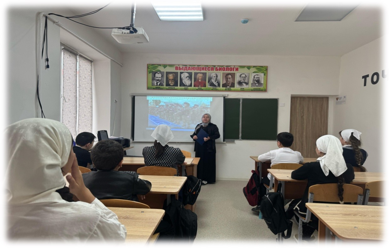 В МБОУ «ООШ им. Аласханова Т-А. А. с. Саясан» 08.04.2025г. зам.дир. по ВР Насухановой А.В., для обучающихся 6 класса проведен Урок мужества «Герои СВО», охват-10 чел.