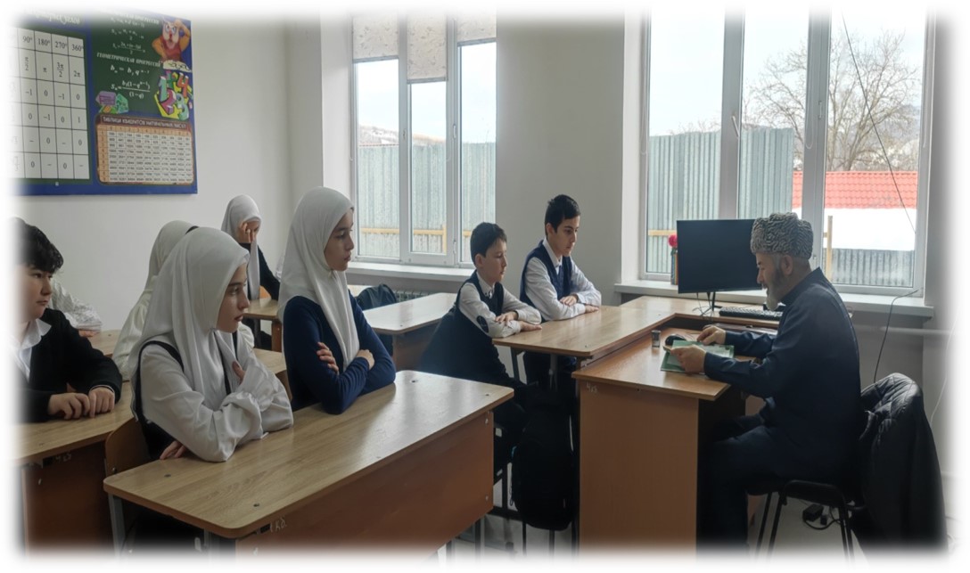 08.04.2025г. ДНВ Асхабов А.Х. провел беседу для обучающихся 5-8 класса на тему: «Основы традиционного Ислама», охват-36 чел.