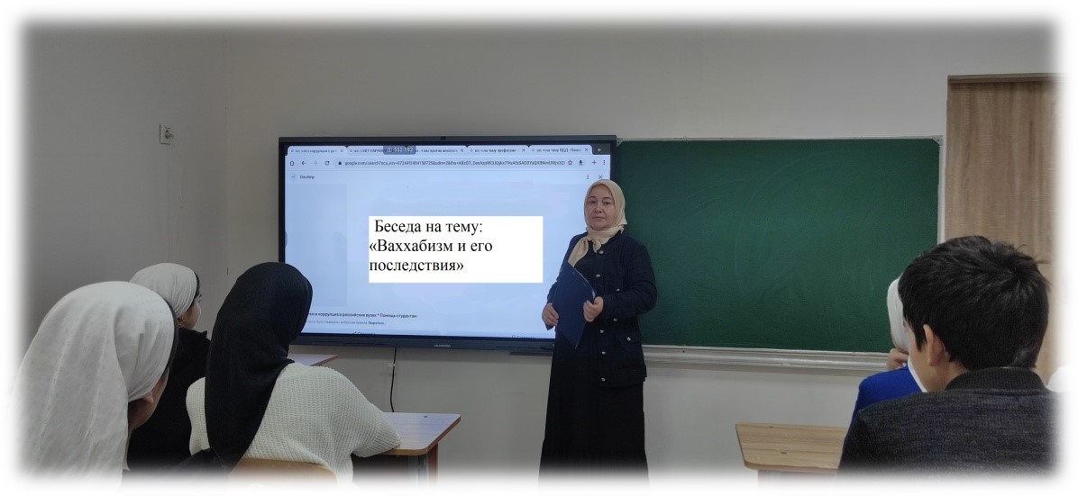19.04.2025г. зам. дир.по ВР Насуханова А.В. провела беседу для обучающихся 8 класса на тему: «Ваххабизм и его последствия», охват-12 чел.