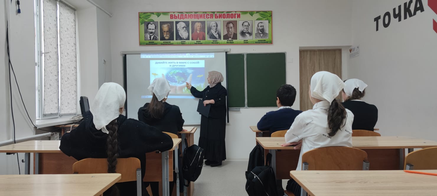 Руководители 5-9 классов провели с учащимися кл.час: " Жить в мире с собой и с другими ",с целью формировать толерантное и уважительное отношение друг к другу.Развивать память,мышление,речь.