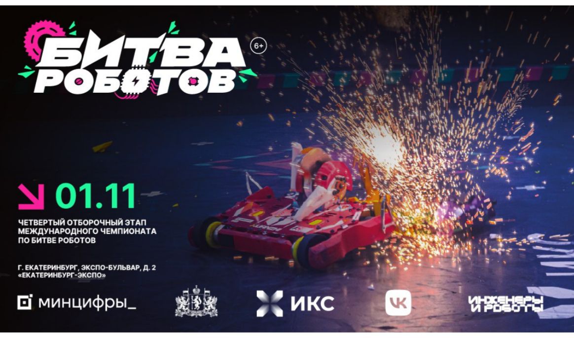 28.10.2025Минцифры России в соответствии с распоряжением Правительства Российской Федерации от 11 апреля 2023 г. № 889-р сообщает о проведении четвертого отборочного этапа Международного чемпионата по битве роботов сезона 2025 года (далее - Чемпионат, мероприятие). Цель Чемпионата - популяризация в Российской Федерации инженерной мысли как драйвера развития и поддержки современных цифровых технологий. Три отборочных этапа Чемпионата прошли на территории Пермского края, Московской и Ленинградской областей, в которых приняли участие 84 команды со всего мира, из них только 24 команды встретятся в финальном этапе, чтобы побороться за титул чемпиона битвы роботов 2025 года. На текущий момент прямую трансляцию этапов посмотрели более 14 млн человек, свыше 18 тыс. человек посетили отборочные этапы. В четвертом отборочном этапе Чемпионата сразятся 28 команд из России, Беларуси, Индии и Китая: 16 команд в рамках дисциплины «Битва роботов» в весовой категории до 110 килограмм и 12 команд в рамках дисциплины «Битва мини-роботов» в весовой категории до 1,5 килограмм. Среди участников - команды МТУСИ, СПбГУТ им. М.А. Бонч-Бруевича, Высшей Школы Нефти, МИСИС, ИТМО, СПбПУ Петра Великого, ДГТУ, МИРЭА, НГТУ НЭТИ и других ведущих университетов. Мероприятие пройдет 1 ноября 2025 г. с 11:30 до 19:30 (по местному времени) при поддержке Правительства Свердловской области на территории Международного выставочного центра «Екатеринбург-ЭКСПО» по адресу: Свердловская область, г. Екатеринбург, ЭКСПО-бульвар, д. 2. Программой мероприятия предусмотрено два шоу: дневное (с 13:00 до 14:30) и вечернее (с 18:00 до 19:30).
