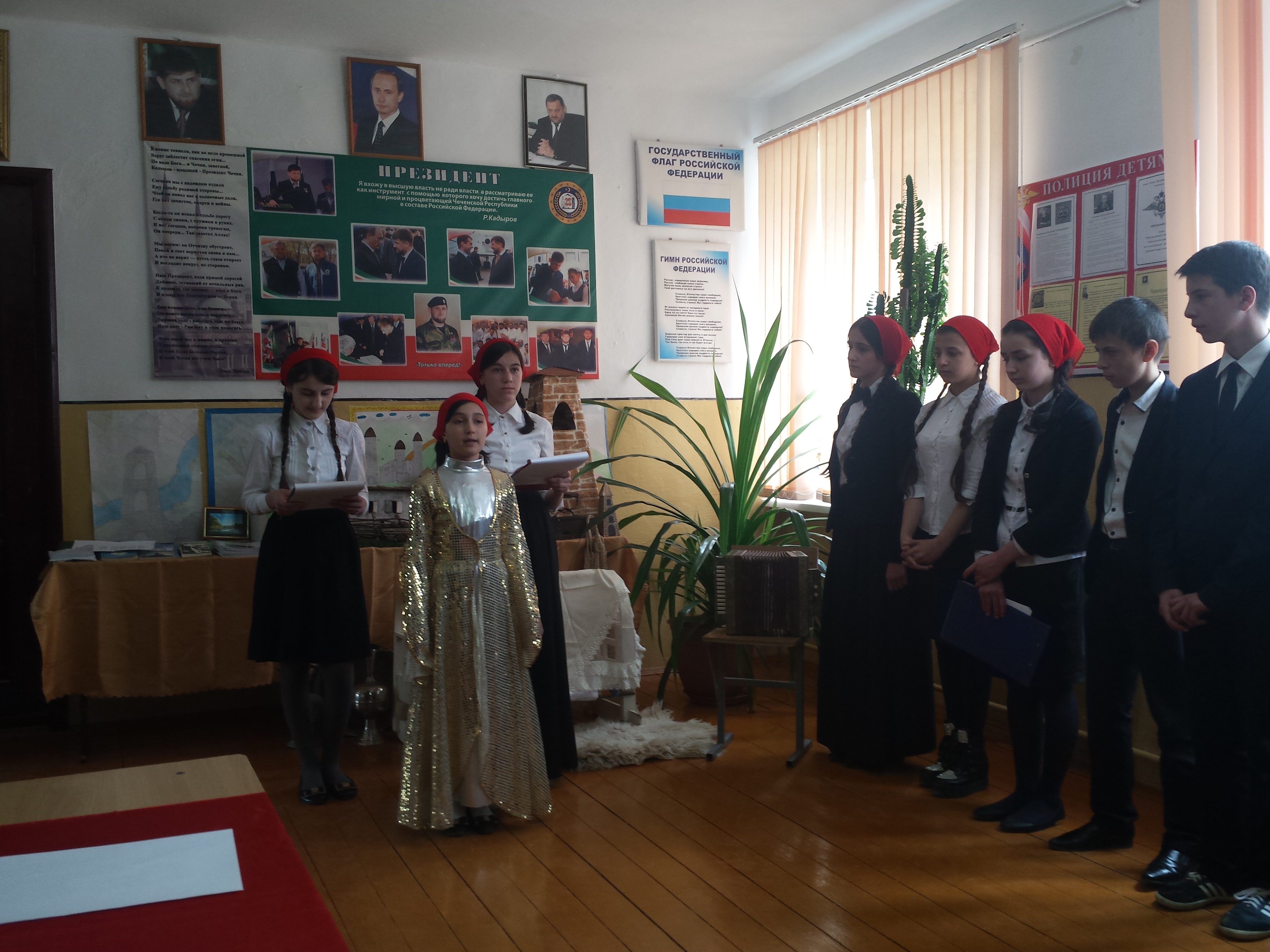 23.04.2015Руководителем мероприятий была учитель чеченского языка и литературы Тактабаева А.А.. В мероприятиях, посвященных Дню чеченского языка, участие принимали все обучающиеся 1-9 классов. Помогала в проведении мероприятий учитель чеченского языка и литературы Дуруева Ш.Б.. Мероприятия, посвященные Дню чеченского языка, проводились по плану, утвержденному приказом министерства образования и науки Чеченской Республики. На протяжении недели обучающиеся старших классов писали сочинения по теме: «Ненан мотт- дахаран хазна», а обучающиеся начальных классов писали диктанты по данной теме. С обучающимися 5-9 классов учителя чеченского языка и литературы на протяжении недели провели лекции, доклады, а с обучающимися 1-4 классов учителя проводили беседы по теме: «Сан ненан мотт-уггаре а хаза». В школе была проведена выставка произведений чеченских писателей. На уроках литературы обсуждались стихи чеченских поэтов: Саидова Б., Арсанукаева Ш., Айдамирова А., Джамалханова З., Кибиева М. и др.
